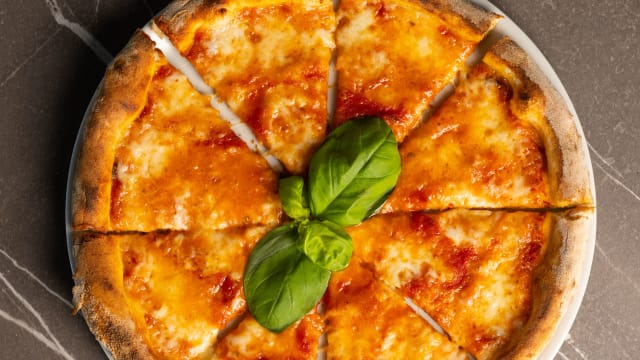 Impasto con farina origine casillo, grano antico solina e senatore cappelli con salsa ai 3 pomodori, mozzarella fior di latte, in uscita basilico fresco.