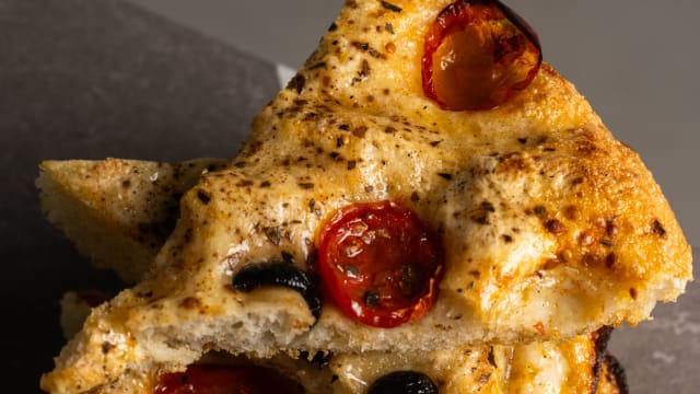 Impasto con farina origine casillo, grano antico solina e senatore cappelli, sale, origano, pomodorini e olive.
