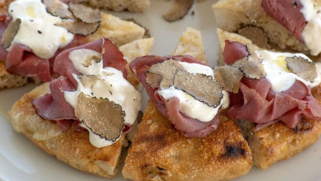 Impasto con farina origine casillo, grano antico solina e kamut con provola affumicata, caciocavallo, pepe e capocollo croccante al vincotto.