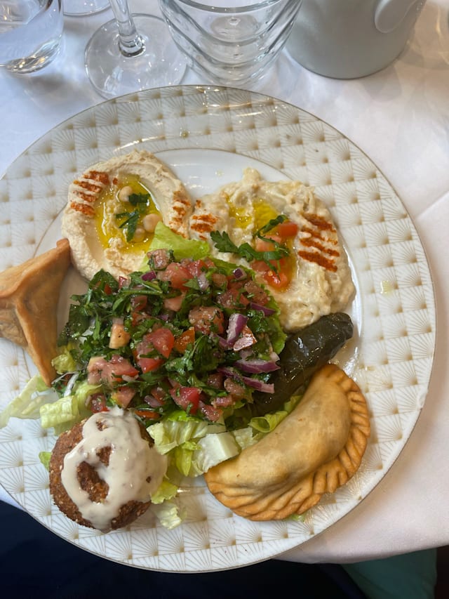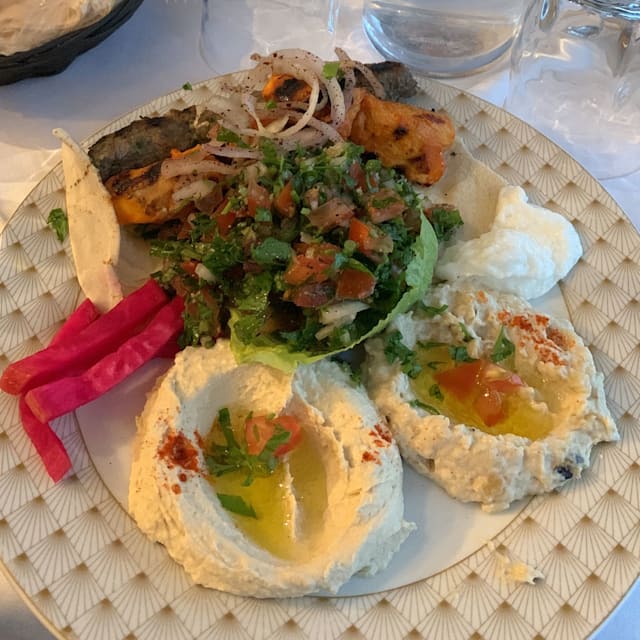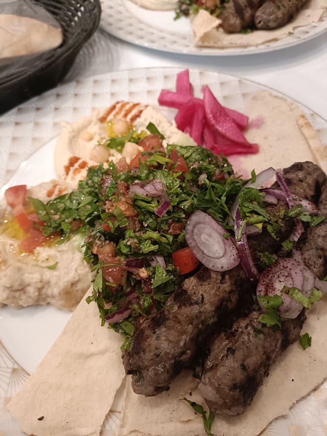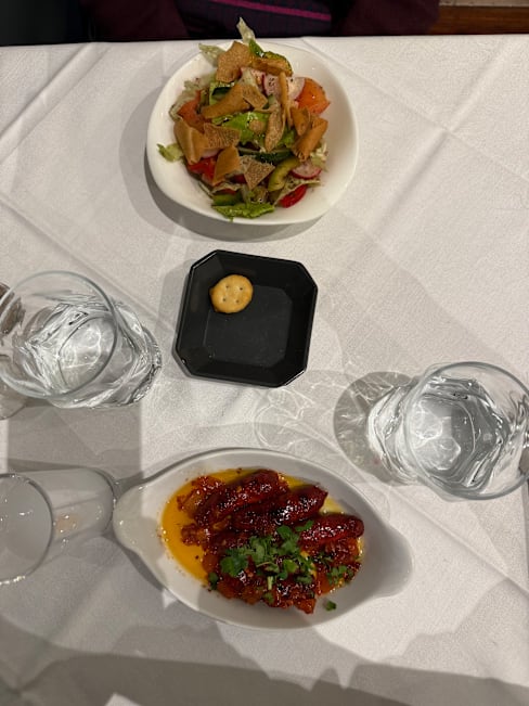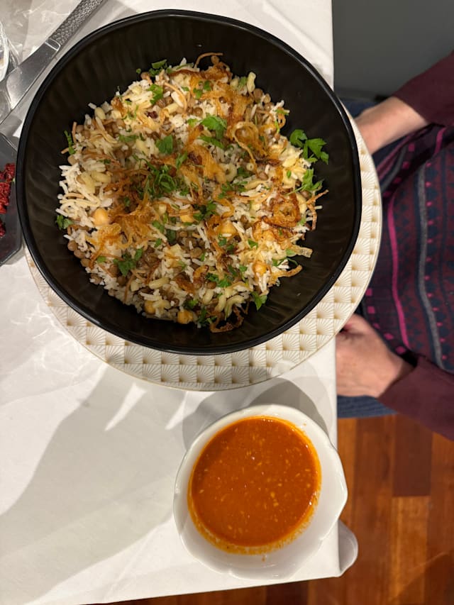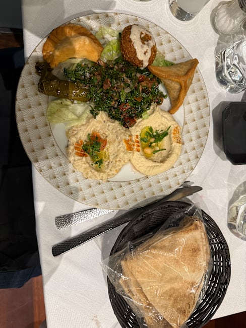 10/10Very nice dinner with generous portions. Oddly, the meal starts with a complimentary bowl of butter crackers. Then we had tasty Lebanese sausages which were flavored with paprika and the fattoush salad. The salad was very flavorful with lots of fresh veggies but not enough pita chips. Maybe offering a small bowl of chips on the side would be beneficial! The pasta/rice/lentil dish with tomato sauce you pour on top was generous and tasty. And the vegetarian platter included the best, fresh falafel ever. I want to go back just for a plate of that falafel. Lots of vegetarian and vegan options but a lot of meat as well. The pasta rice dish an be either.