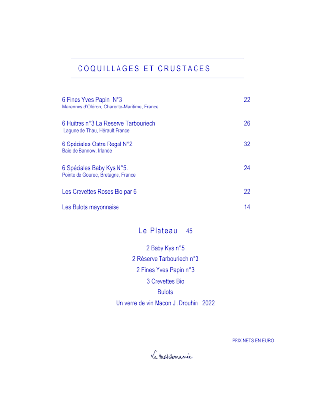 10/10La Méditerranée has a lovely ambiance. The soft lighting in the restaurant highlights walls painted by Christian Berard and Marcel Vertès. The food is always good and the service is impeccable. We go there whenever we visit Paris.