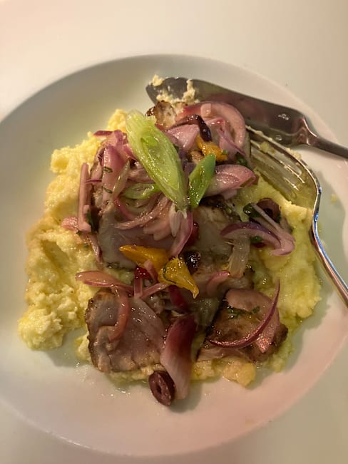 5.5/10Fish soup without depth of flavor & coloring was unappealing. The sole was undercooked in sections, and the eggplant on the plate was grey and underseasoned. Pomagranates did not add to the overall flavoring of the dish.