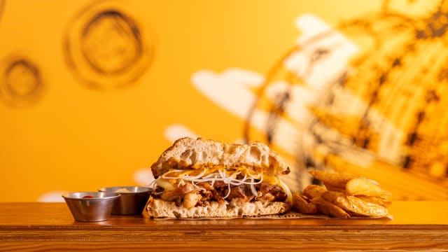 Sfilacci di Cavallo, Cipolla Caramellata, Fromaggio Svizzero, Salsa BBQ e Mostarda