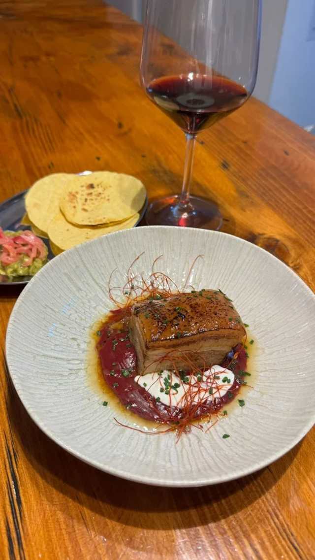 - Secreto ibérico servido en tortillas de maíz con queso fundido.
