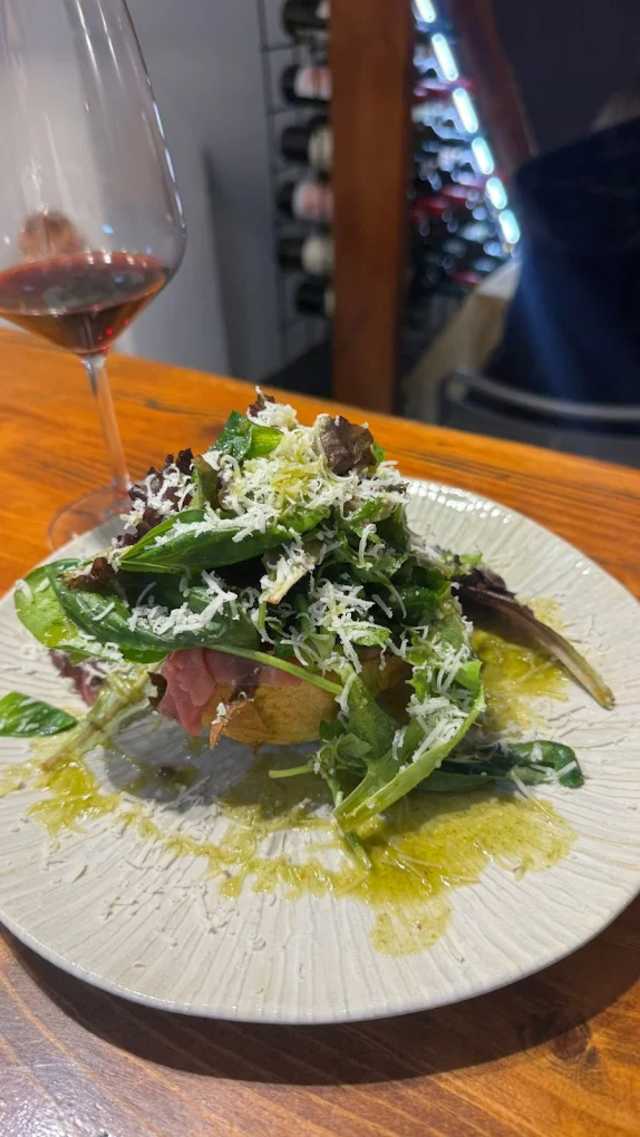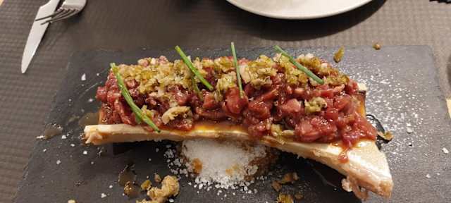 - Interpretación elegante del clásico murciano: crujiente tosta dorada coronada con nuestra ensaladilla “mesa cero”, enriquecida con matices marinos de merluza y mejillón, y culminada con anchoa, boquerón o sola; para aportar profundidad salina y carácter mediterráneo.