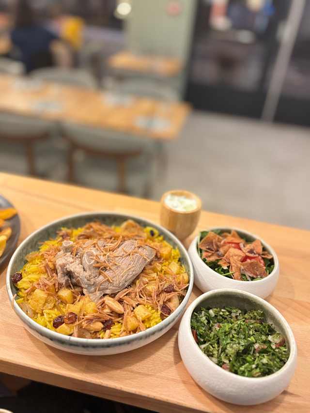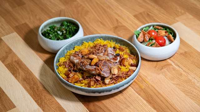 - Riz parfumé, gigot d'agneau, des légumes mijotés et de pommes de terre fondantes, accompagnés avec un taboulé frais, une salade de roquette et un onctueux yaourt à l'orientale.