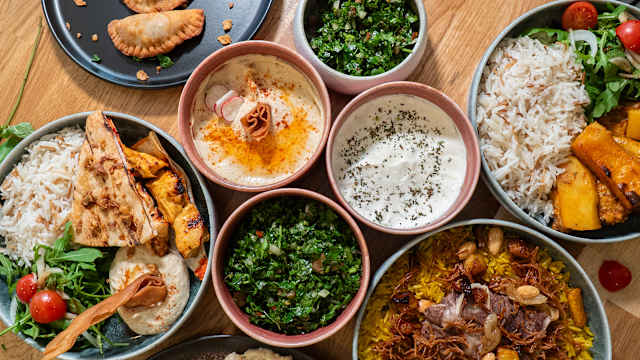 - Feuilles de vigne et légumes farcis à la viande, accompagnés d'un mutabal crémeux et d'un taboulé frais.