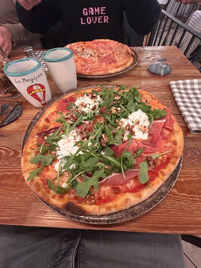 - Mozzarella, funghi gallinacci, speck, crema mascarpone allo zafferano