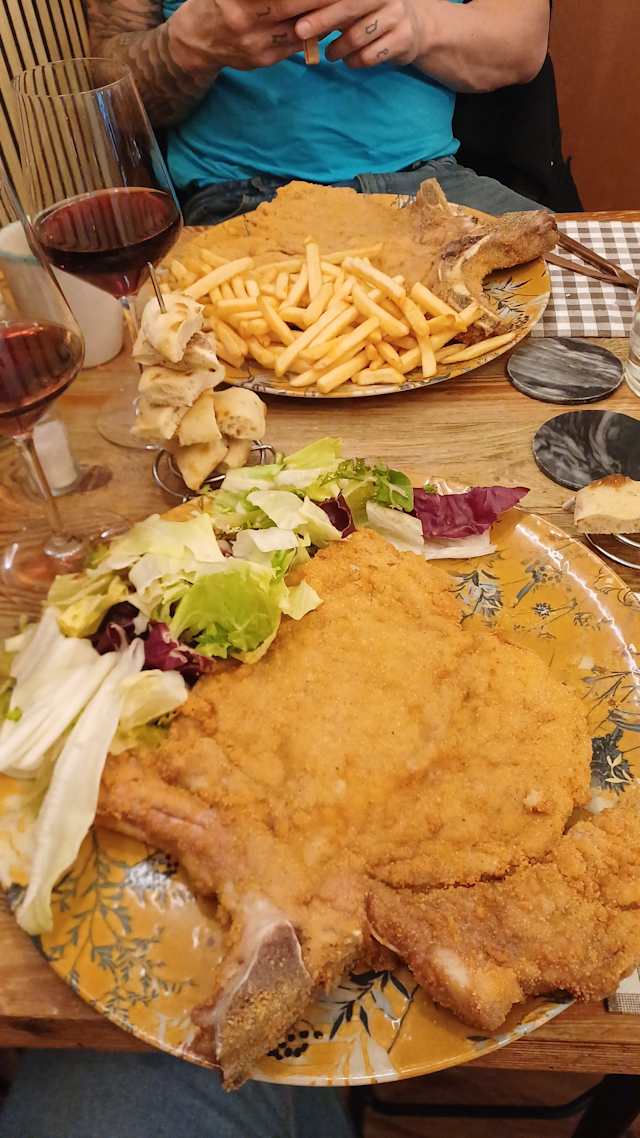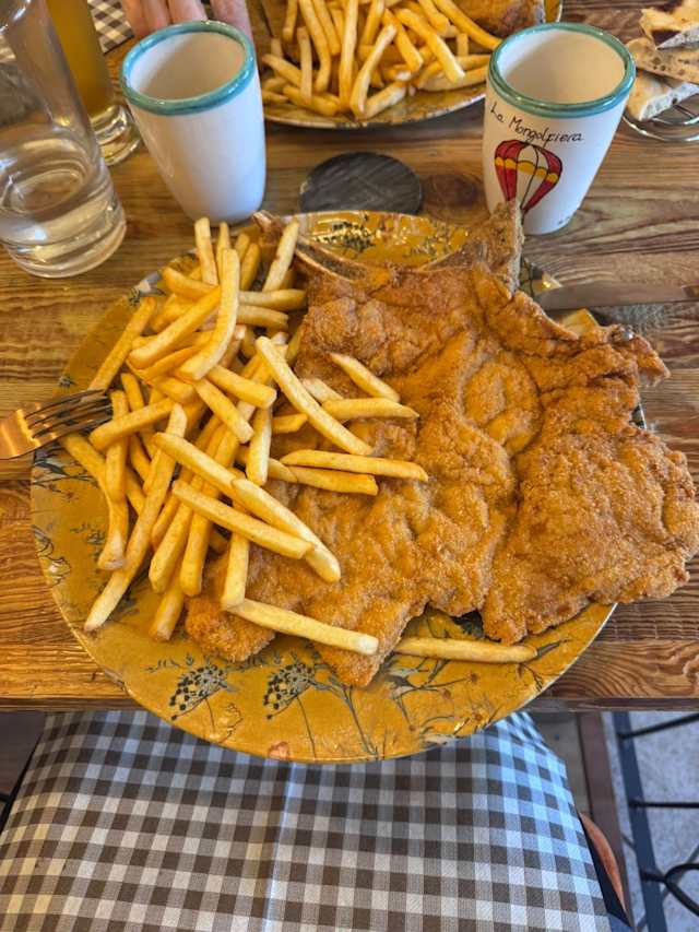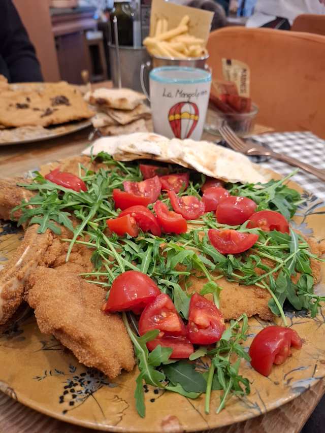 - Maxi cotoletta con contorno a scelta tra patatine fritte e insalata