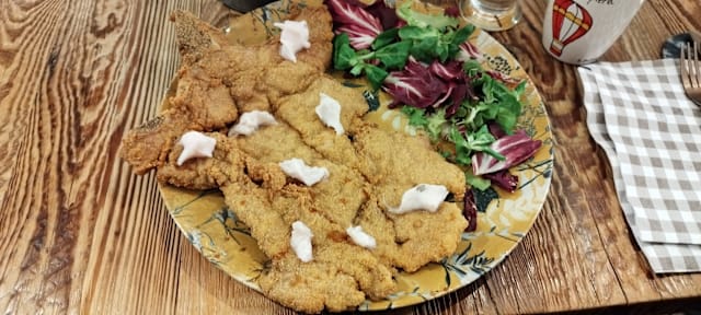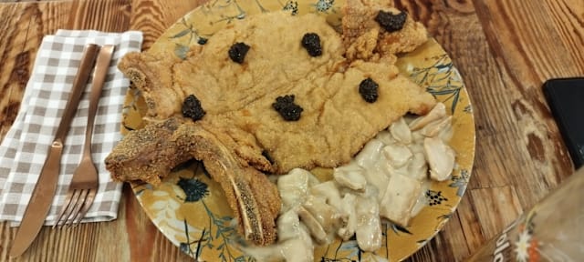 - Maxi cotoletta con crema di noci, stracciatella di burrata, pomodorini semisecchi