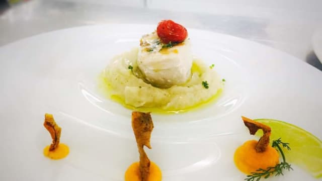 Polpo, patata montata al lime, avocado in crema, datterino, olio alla clorofilla di prezzemolo, glassa ponzu