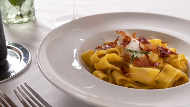 Busiata con crema di zucca, ricotta e pancetta croccante
