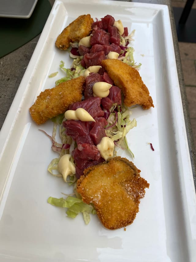 Tacos con tartare di tonno, avocado, salsa allo yogurt e cipolla agrodolce