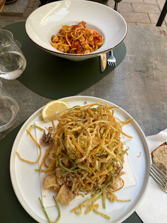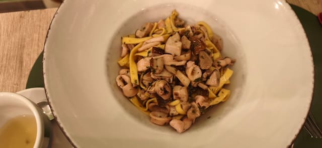 Tagliolini à l'encre de seiche, calamars et tomates cerises