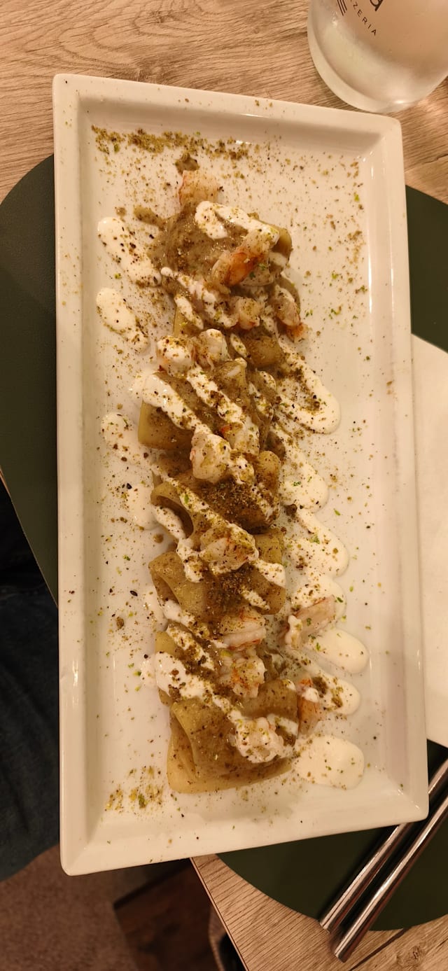 Paccheri al pesto di pistacchio, gamberi di Sanremo al lime e burrata