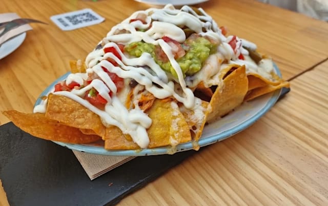 Triángulos de maíz fritos, gratinados con frijoles, queso. Queso cheddar y la proteína a elegir entre pollo, cochinita o birria. Con coberturas de guacamole, crema agria pico de gallo y jalapeños.