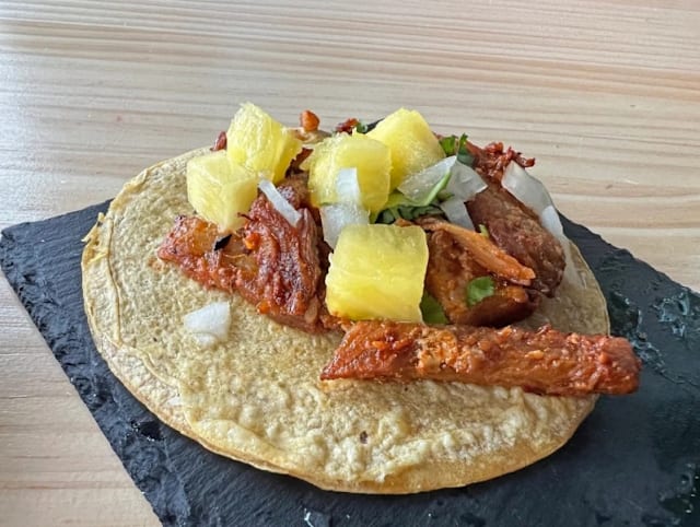 Tortilla de harina de trigo rellena de queso, carne de pastor y piña.