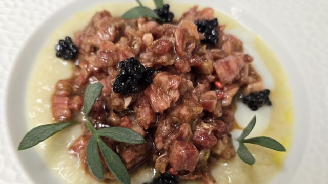 Tartare di wagyu* con su spuma di ceci, gambero rosso e il suo corallo