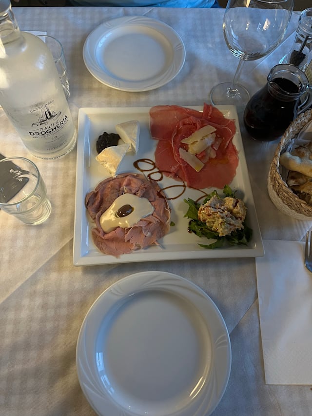 Carpaccio di carne cruda con scaglie di grana, girello di vitello di fassona piemontese con salsa tonnata, insalata russa, robiola di roccaverano dop (formaggio di capra) con cugna’