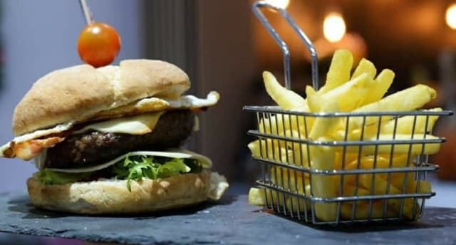 200 g carne de ternera 100%, pan, ketchup, mayonesa, lechuga, queso brie, cebolla caramelizada, tomate.