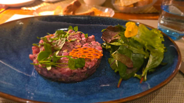 - De chevreuil, huile noisette, châtaigne, airelle fraîche, tapenade de truffe - en entrée (80gr.)