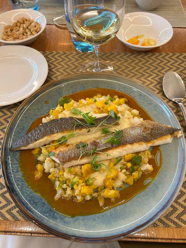 - Loup de mer poêlé minute, mousseline de choux-fleurs aux agrumes, déclinaison multicolores, réduction clémentine