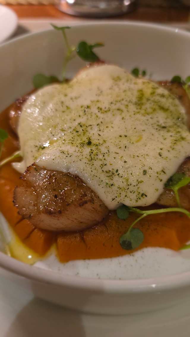 - Saint-jacques snackées, purée de potimarron, noisettes torréfiées, huile de cèpes et espuma de gingembre
