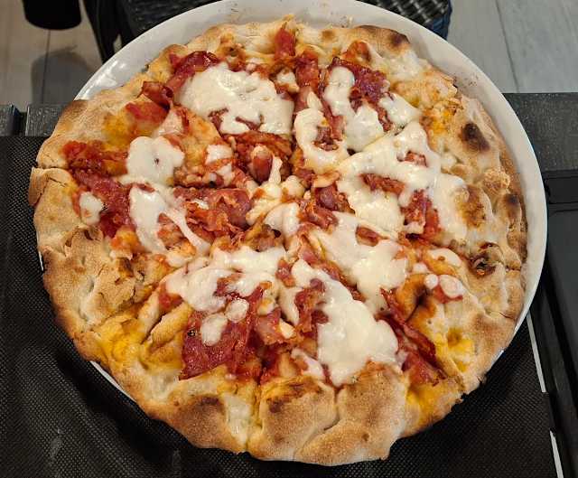 - Pomodoro, mozzarella mix di latte vaccino e bufala, porcini, speck, salsiccia, olive nere
