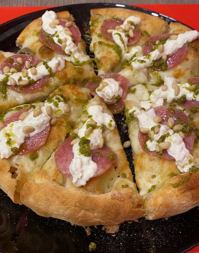 - Mozzarella mix di latte vaccino e bufala, ciauscolo, pesto genovese, burrata, pinoli
