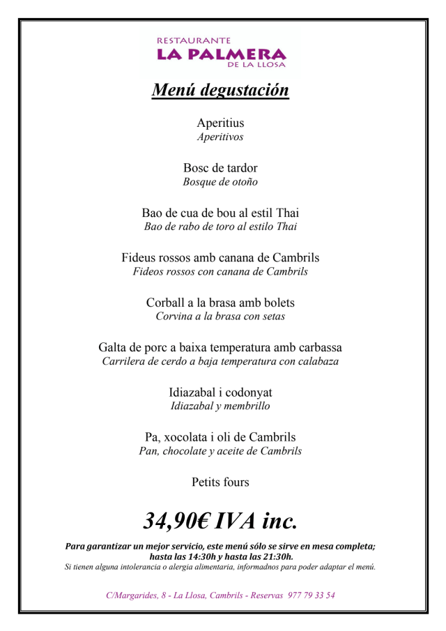 9/10We had a fabulous meal here as a family with teenagers. The mood was relaxed and the two waitresses lovely. We had the PicaPica menu which largely had good options for our slightly fussy eaters. Everything was beautifully presented and very tasty. A great option and s change from the waterfront of Cambrils.