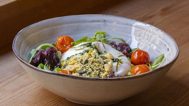 - Base de hummus, rúcula, pollo desmechado con aguacate y perlas de mozzarella, huevo poché, y dukkah (semillas de chía, anacardos, nueces, curry y almendras).