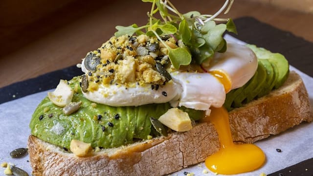 - Aguacate, huevo campero pochado, micromezclum, lima y dukkah (semillas de chía, anacardos, nueces, curry y almendras).
