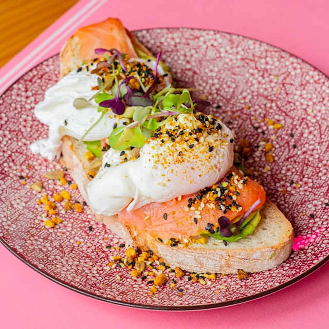 Aguacate, salmón, 2 huevos camperos poché, micromezclum, lima y dukkah (semillas de chía, anacardos, nueces, curry y almendras).