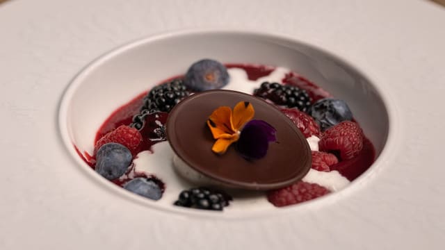 Crémeux au chocolat noir 70%, curable cacao amer, crème glacée à la noisette, espuma au café