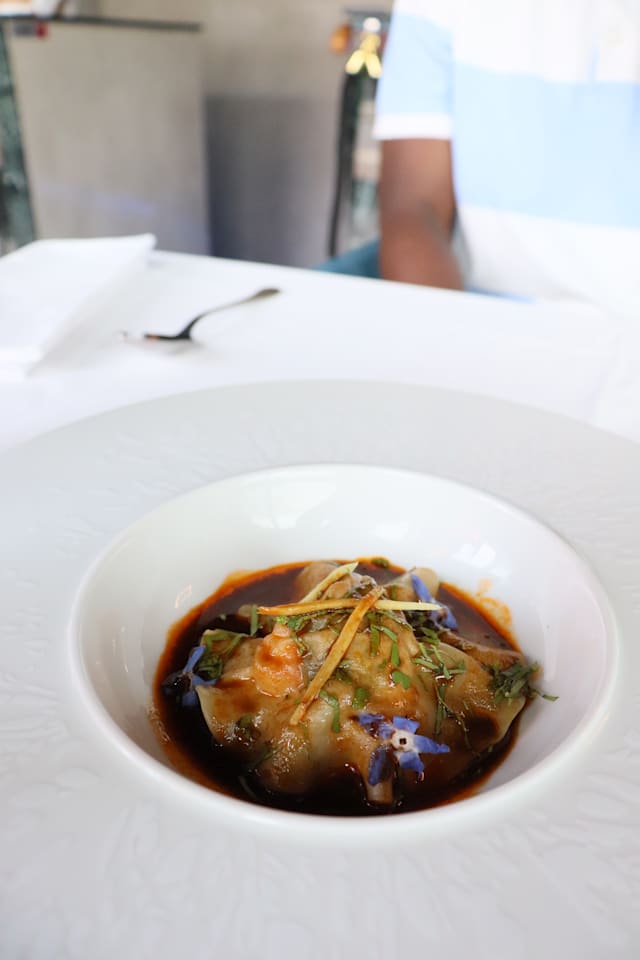 - À l’étuvée, andouille de Guémené, embeurrée de chou, crème de perles iodées