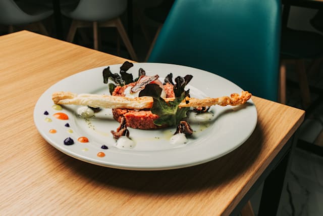 Battuta di manzo, dressing acciuga-capperi, tuorlo CВТ, pomodorini confit