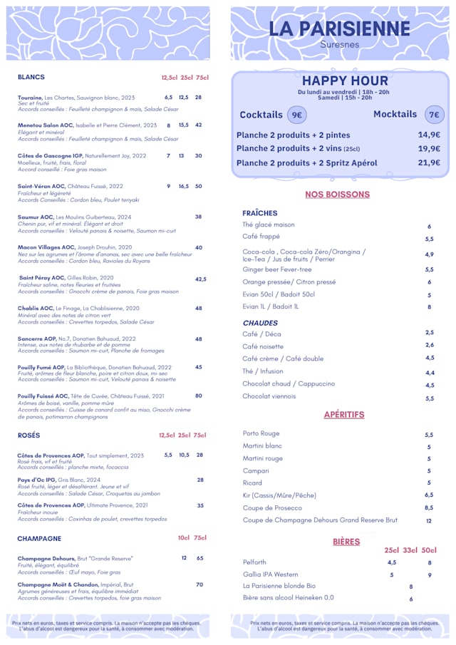 Aux allures d'un bistrot parisien, "La Parisienne" propose une cuisine moderne fait maison dans un cadre chaleureux.