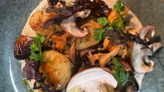 Crème de truffe, champignons de paris, tomates cerises, parmesan reggiano DOP 15 mois, granella de noisettes a la truffe, roquette