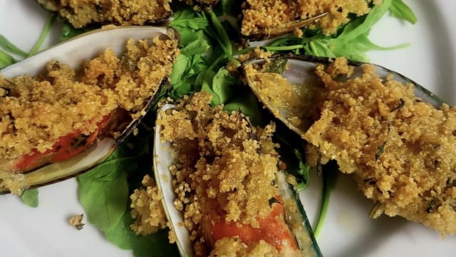 Cozze scottate a mezzo guscio condite con panatura al pane profumato alle erbe e spezie mediterranee, olio evo e ripassate in forno