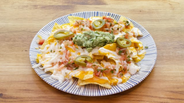 Totopos con queso cheddar, queso gouda, guacamole, pico de gallo y jalapeños.