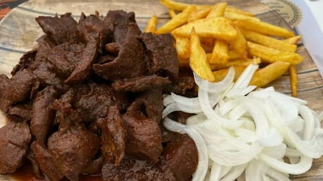 (Corazón de res marinado en ají especial, acompañado de patatas y curtido de cebolla)