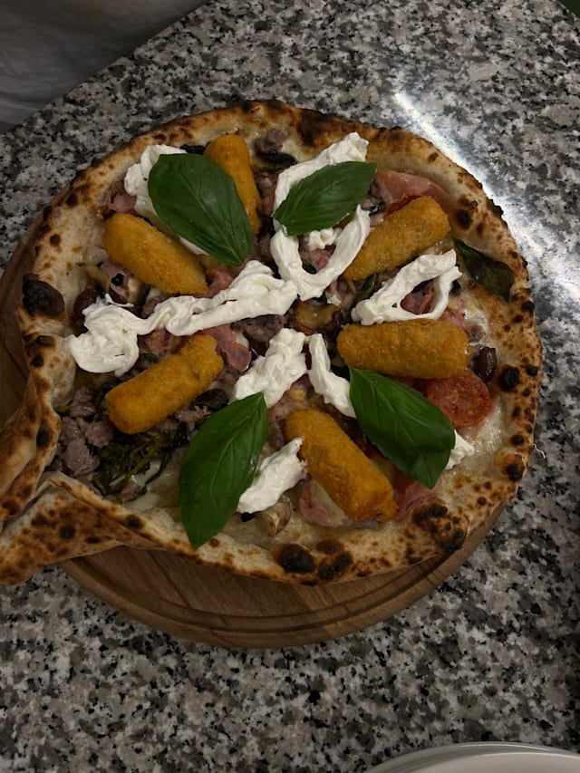Doppia pallina di impasto poste una sopra l'altra ripiene nel mezzo con ricotta,provola affumicata, affur prosciutto cotto, salamino piecante e al di sopra con pomodoro mozzarella, scaglie di grana ebasilico