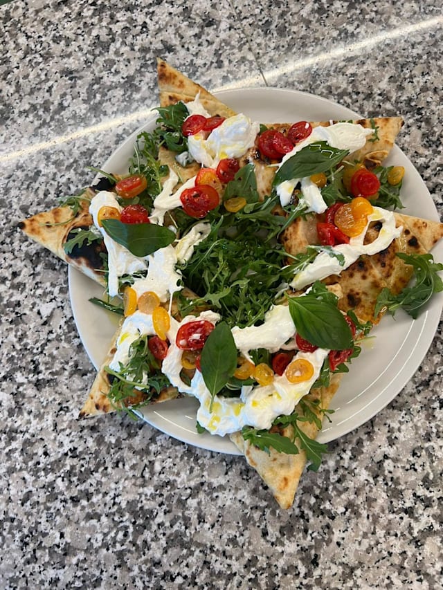 Stracciatella di bufala, pomodorini pachino del vesuvio, melanzane fritte, olive taggiasche e basilico