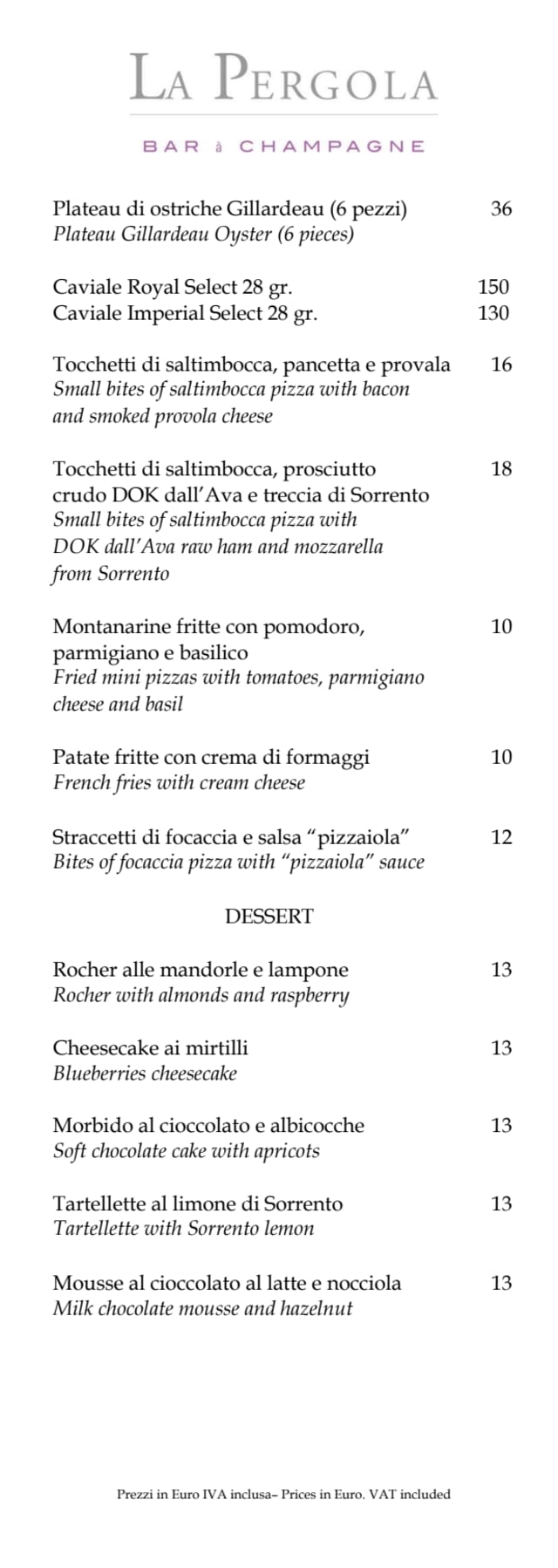 Dear Sarah Straub, Thank you for your lovely review. We’re delighted that everything met your expectations and that you enjoyed the food, service and atmosphere. We hope to welcome you back soon. Warm regards, La Pergola Bar à Champagne Grand Hotel Excelsior Vittoria