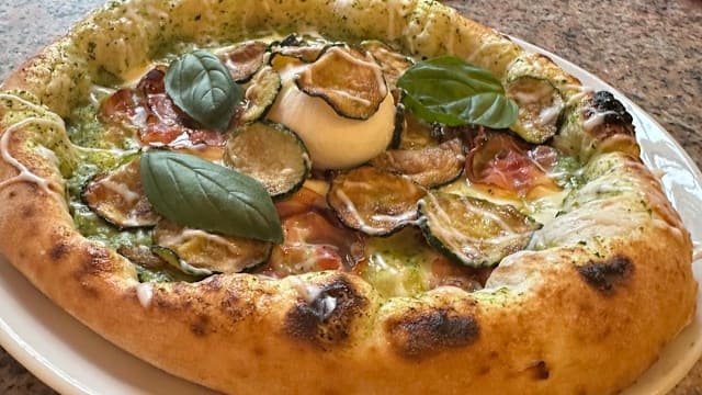 Base con crema di zucchine, fior di latte, pancetta, zucchine fritte, bocconcino di burrata e fonduta di parmigiano