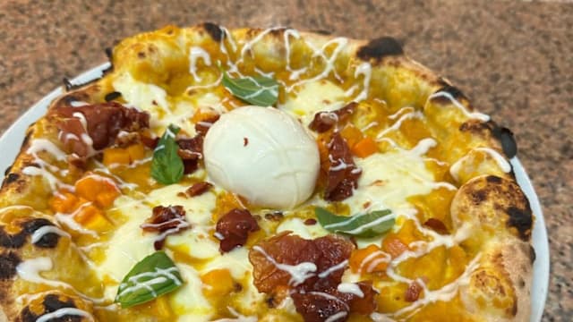 Base con crema di zucca rossa, fior di latte, speck croccante, cubotti di zucca, bocconcino di burrata e fonduta di parmigiano