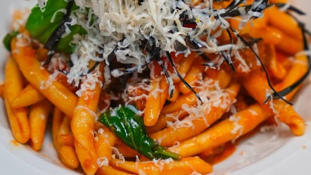 Pasta con salsa di pomodoro, peperoncino, formaggio