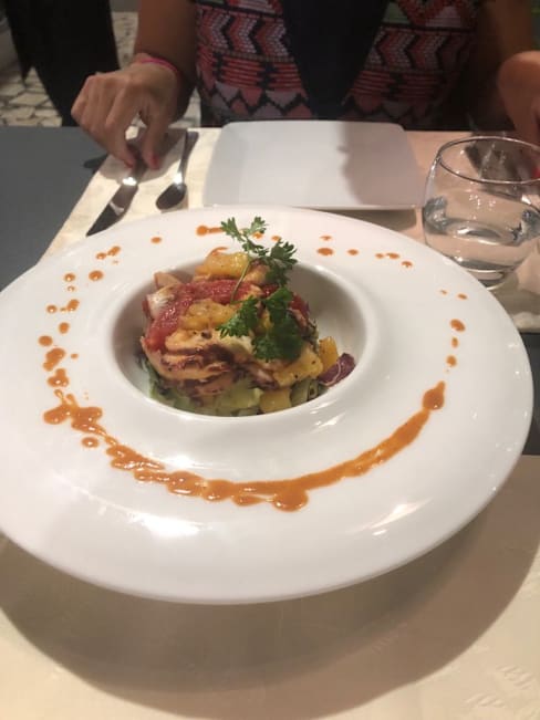 7.5/10Very nice seafood and local wine in a side street experience (i.e. no view and lots of street and outside noise). We chose to eat outside so no complaints but something to keep in mind. There is a large inside dining area but the outside tables and chairs seemed nicer. We had tuna (raw and seared) and salmon and each had great flavor and good portions. We dined on a Wednesday night and there was one waiter for the restaurant-he did a nice job but as the restaurant filled up he was stretched between inside and outside. I did not pay attention when booking as we were near the City Center so it was a bit of a walk as the location is past the cruise terminal just off the sea. Enjoyed our meal but also felt we could have had an equal experience closer to our apartment.