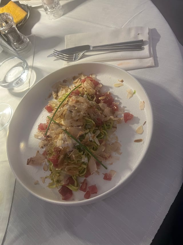 Tagliolino al pesto di basilico fresco, brunoise di tonno, stracciatella pugliese, mandorle tostate e katsuobushi