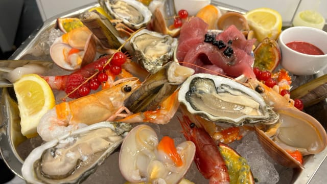 Ostriche gillardeau, gamberi rossi di mazara, scampi del mediterraneo e alchimie dello chef secondo la disponibilità del giorno
